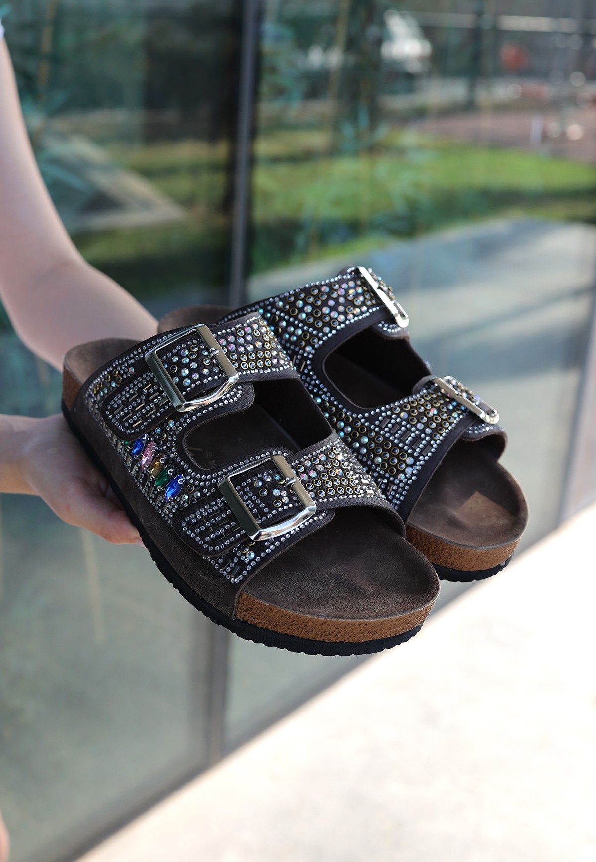 Kahverengi Nubuk Boncuk İşlemeli Terlik