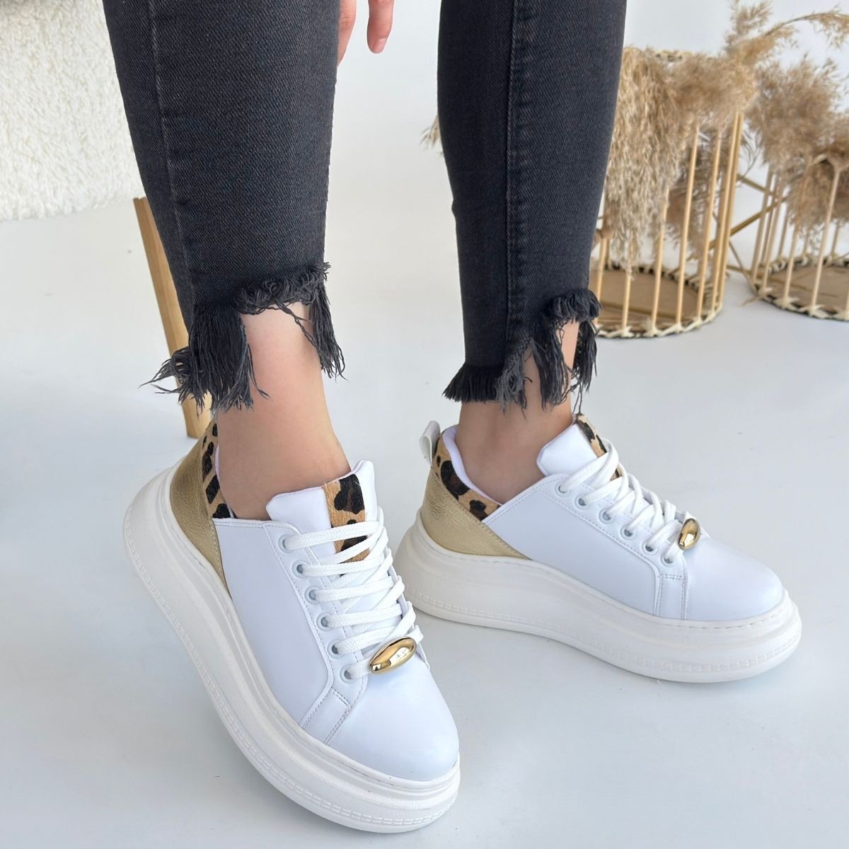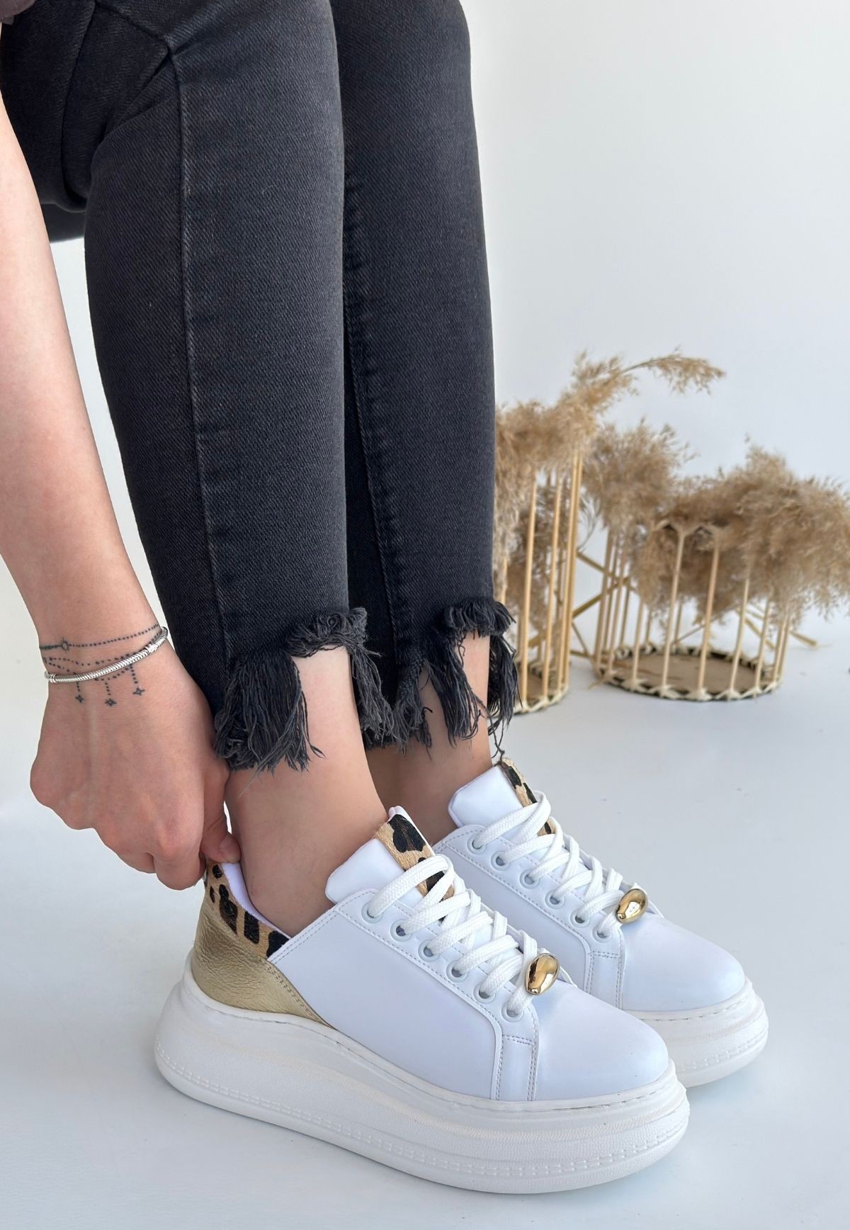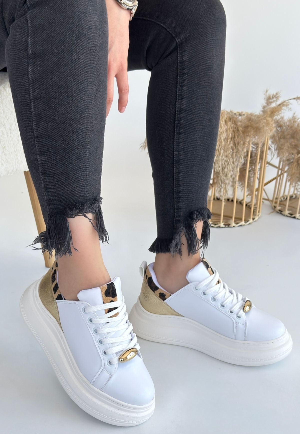 Beyaz Cilt Sarı Detaylı Bağcıklı Spor Ayakkabı