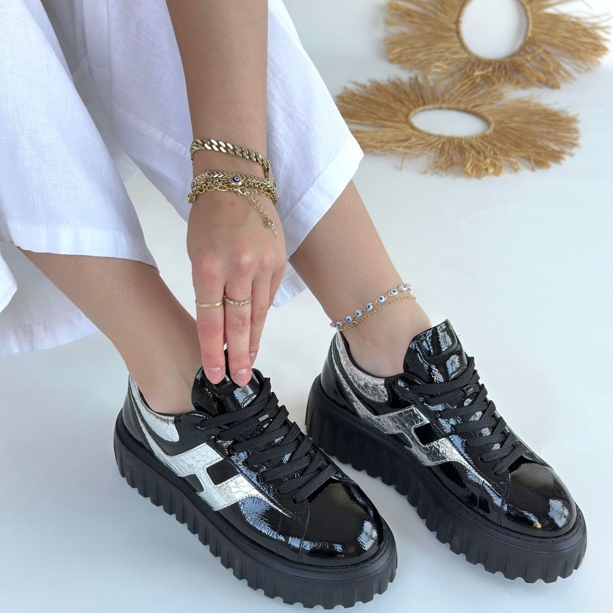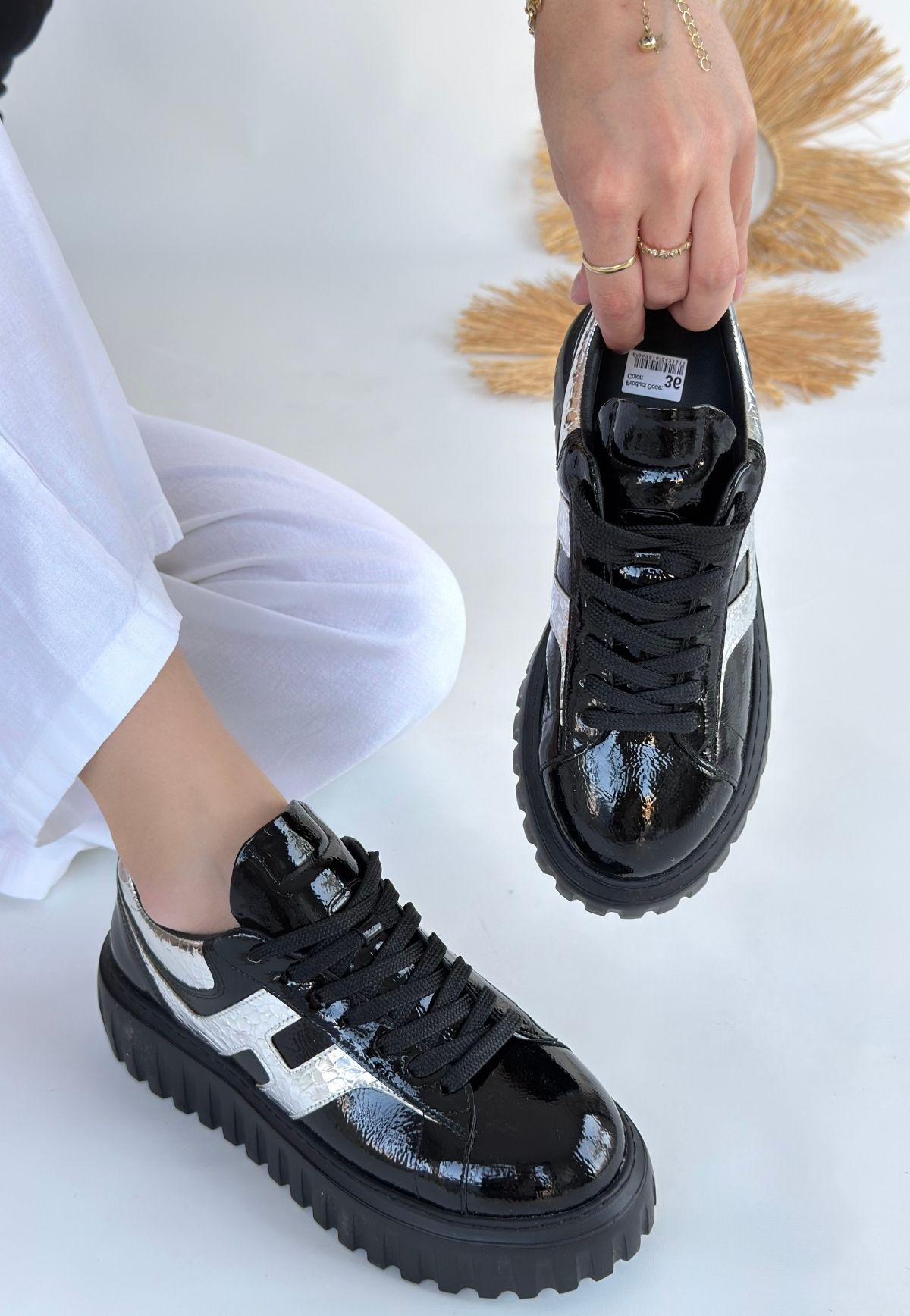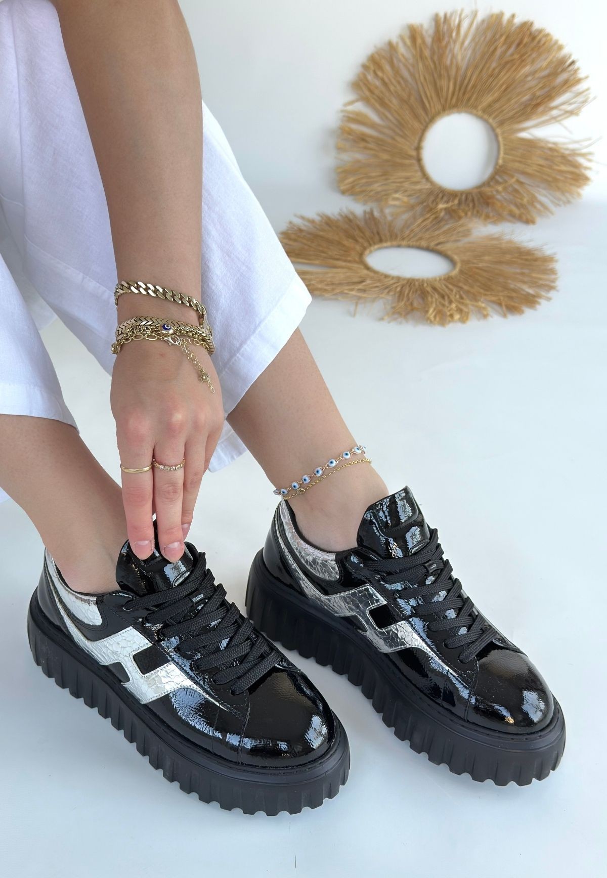 Siyah Rugan Gümüş Detaylı Bağcıklı Spor Ayakkabı