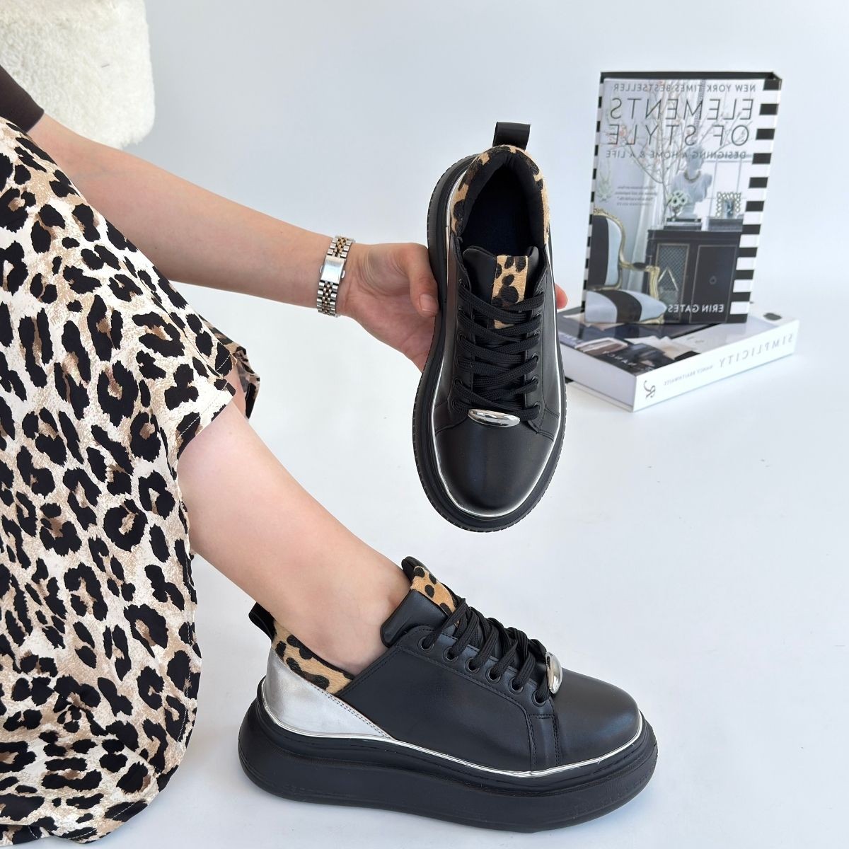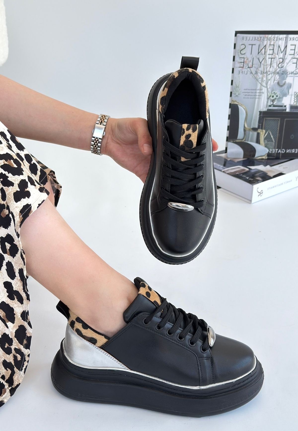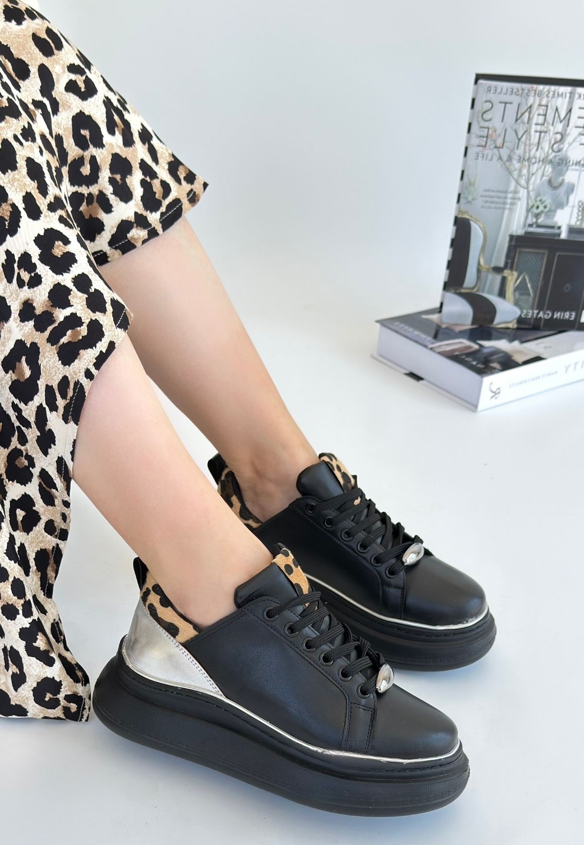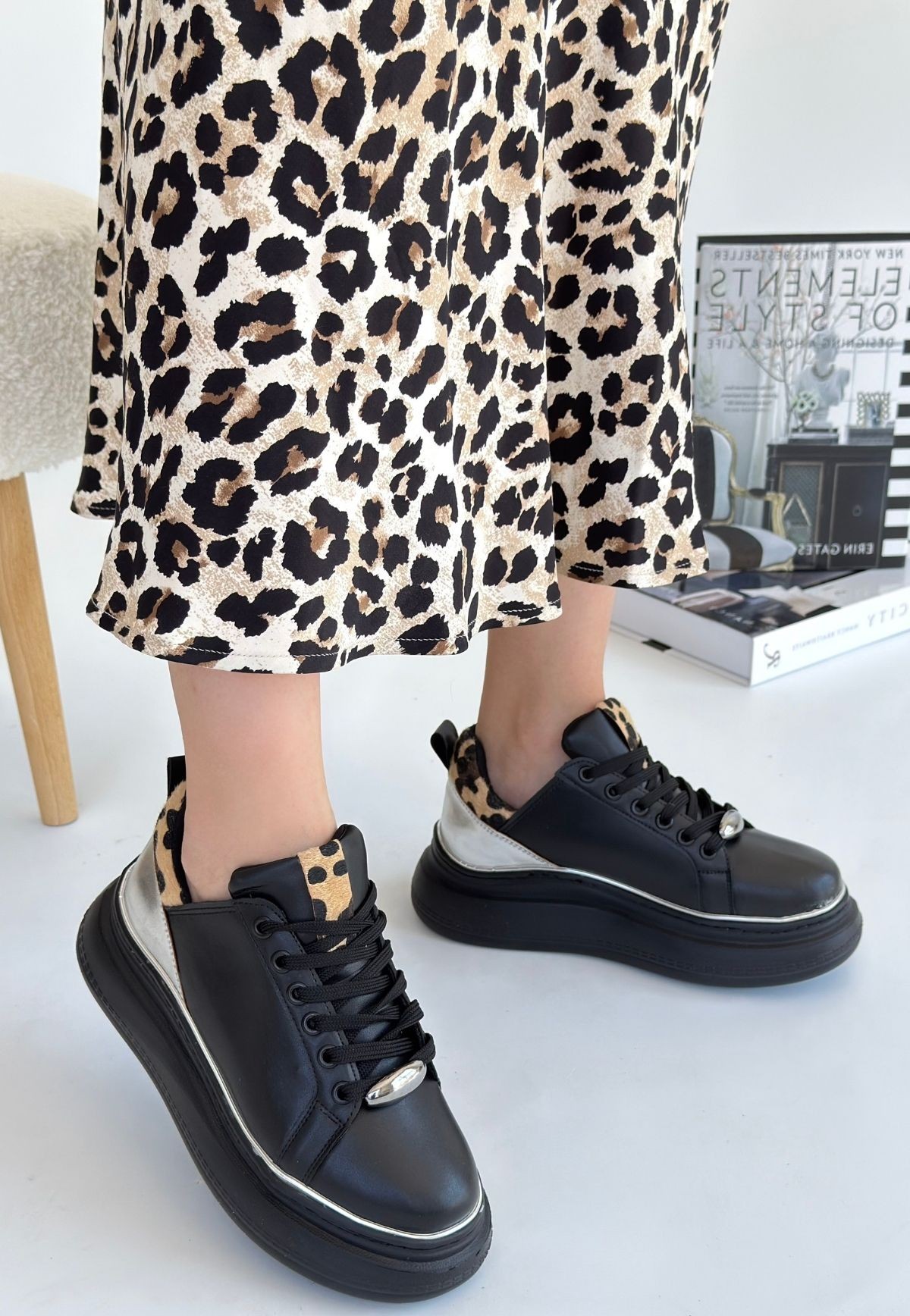 Siyah Cilt Gümüş Detaylı Bağcıklı Spor Ayakkabı