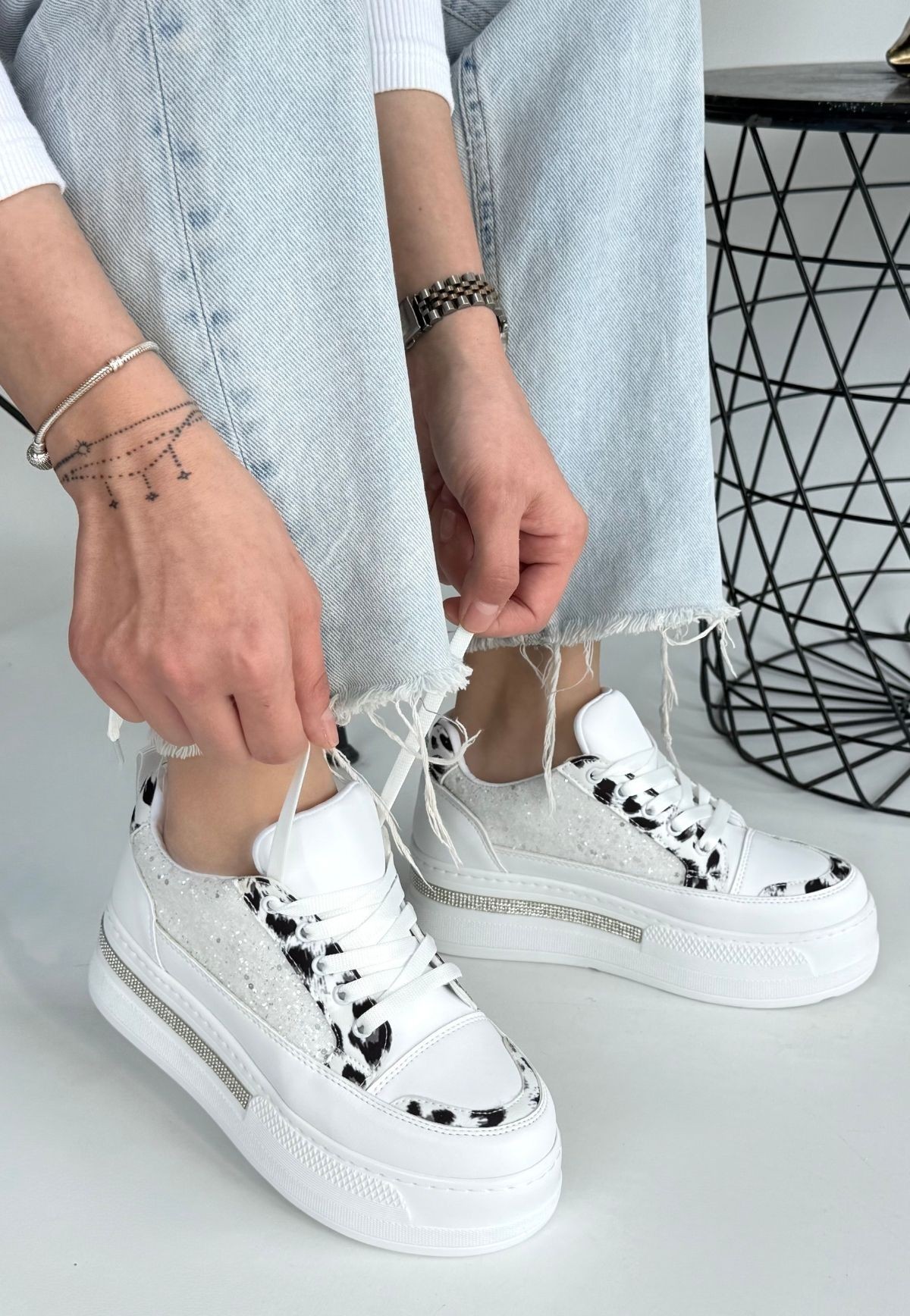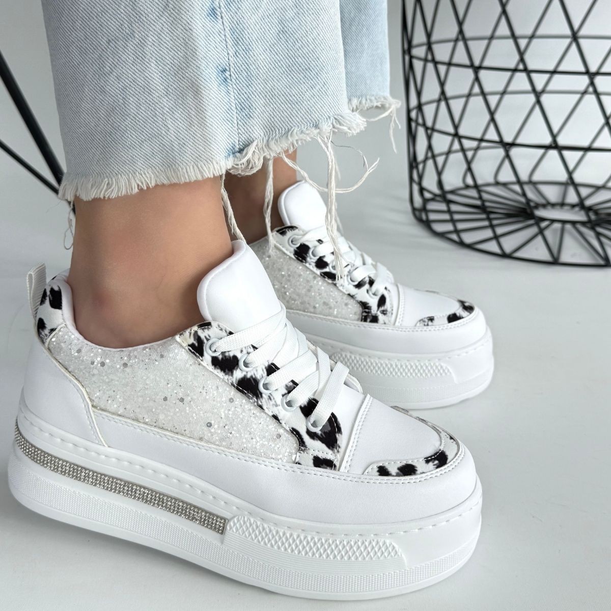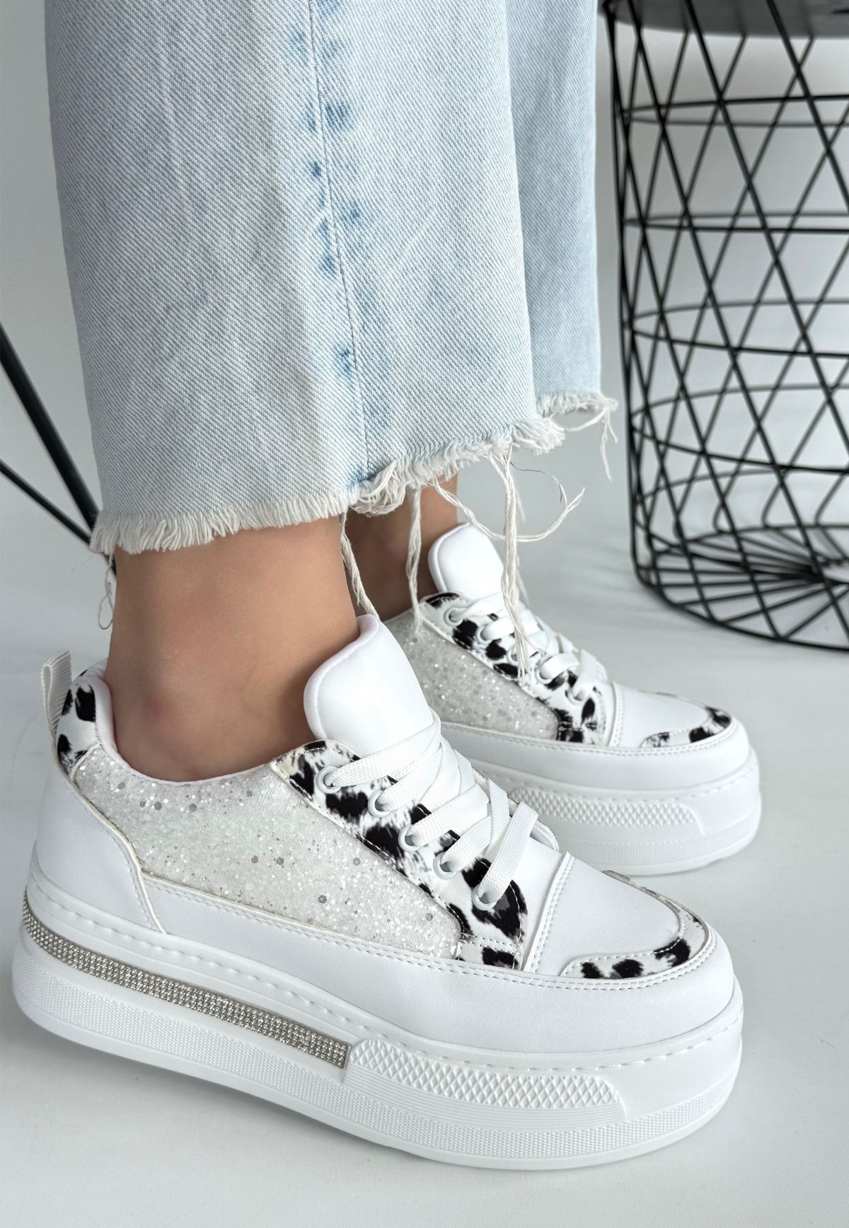 Beyaz Cilt Beyaz Simli Bağcıklı Spor Ayakkabı