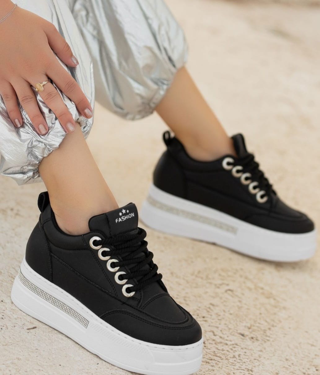 Siyah Cilt Beyaz Tabanlı Bağcıklı Spor Ayakkabı