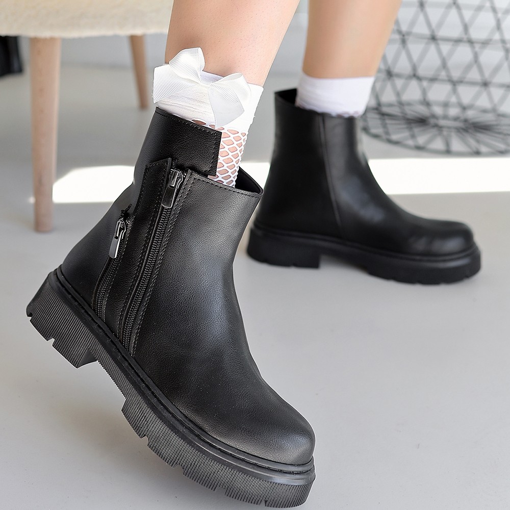 Siyah Cilt Fermuar Aksesuarlı Bot