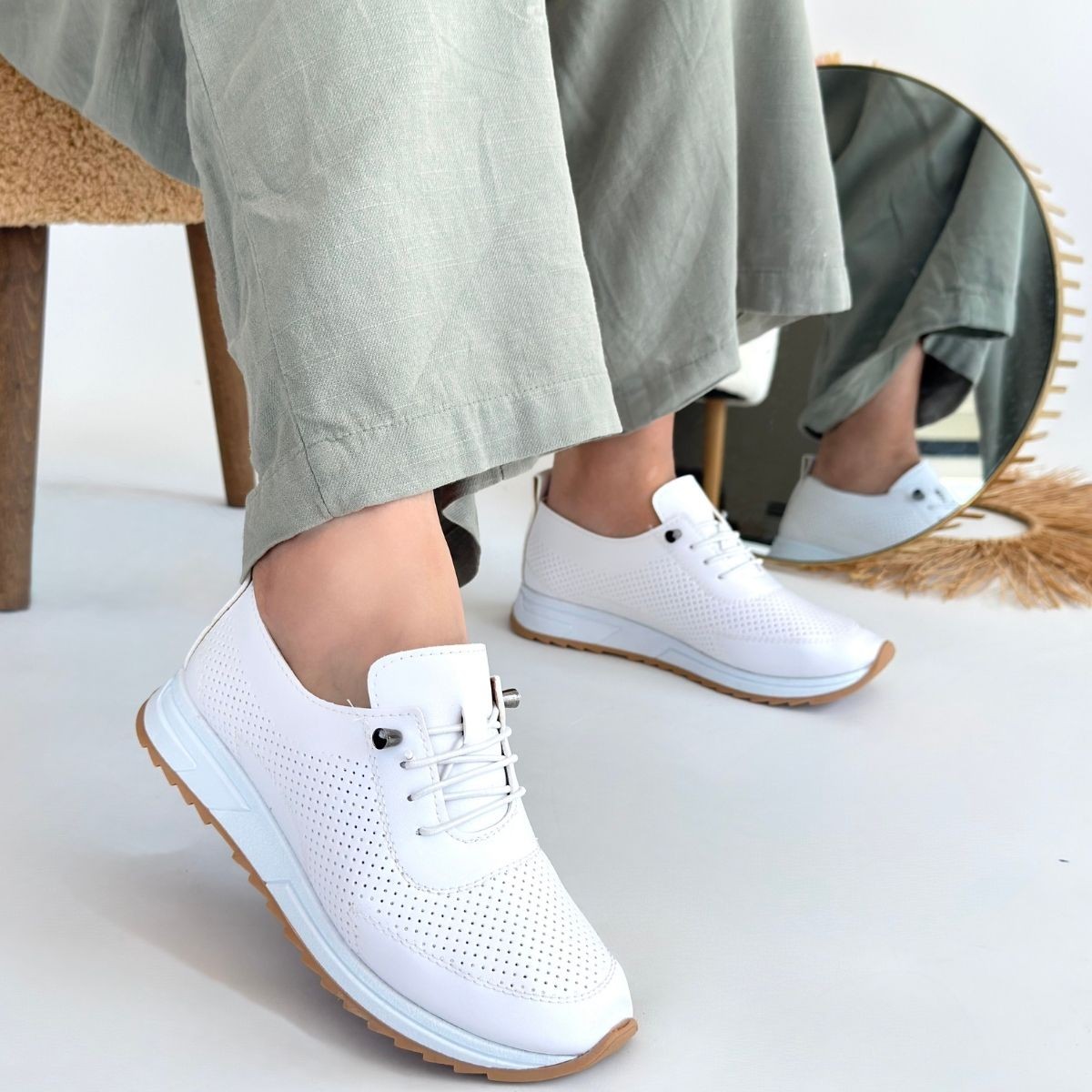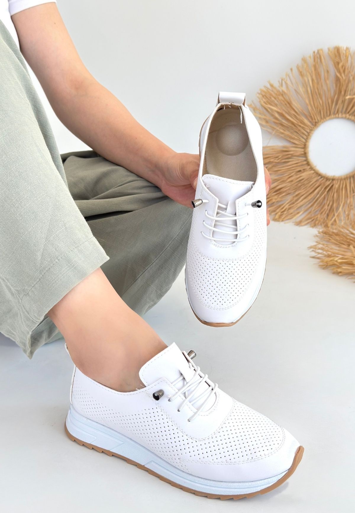 Beyaz Cilt Bağcıklı Spor Ayakkabı